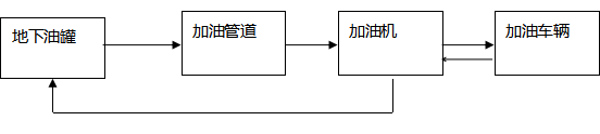 加油工藝:加油作業(yè)時,采用潛油泵提供的動力,油品通過加油管道至加油機,進入受油容器。同時,加汽油作業(yè)時,有油氣回收回收系統(tǒng),汽油蒸汽通過油氣回收管道回至汽油罐。具體流程見下圖: