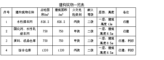 涉及的建構(gòu)筑物有水性漆(106)車間(利舊),固化劑、水性乳液(104)車間(利舊),綜合倉庫,原料、成品倉庫。