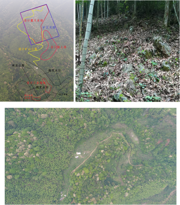 礦區(qū)北側150m山溝邊有三處臨時建筑物(標高約+495m,占地面積約為80m2),為當?shù)卮迕窨撤ッ?、制作筍干的臨時設施,無人居住,主要放置工具等,僅作為1~2人在毛竹成熟時節(jié)短暫作業(yè)時休息場所。除此之外礦山爆破警戒線內無需要保護的其它居民房、名勝古跡、高壓線等建構筑物。