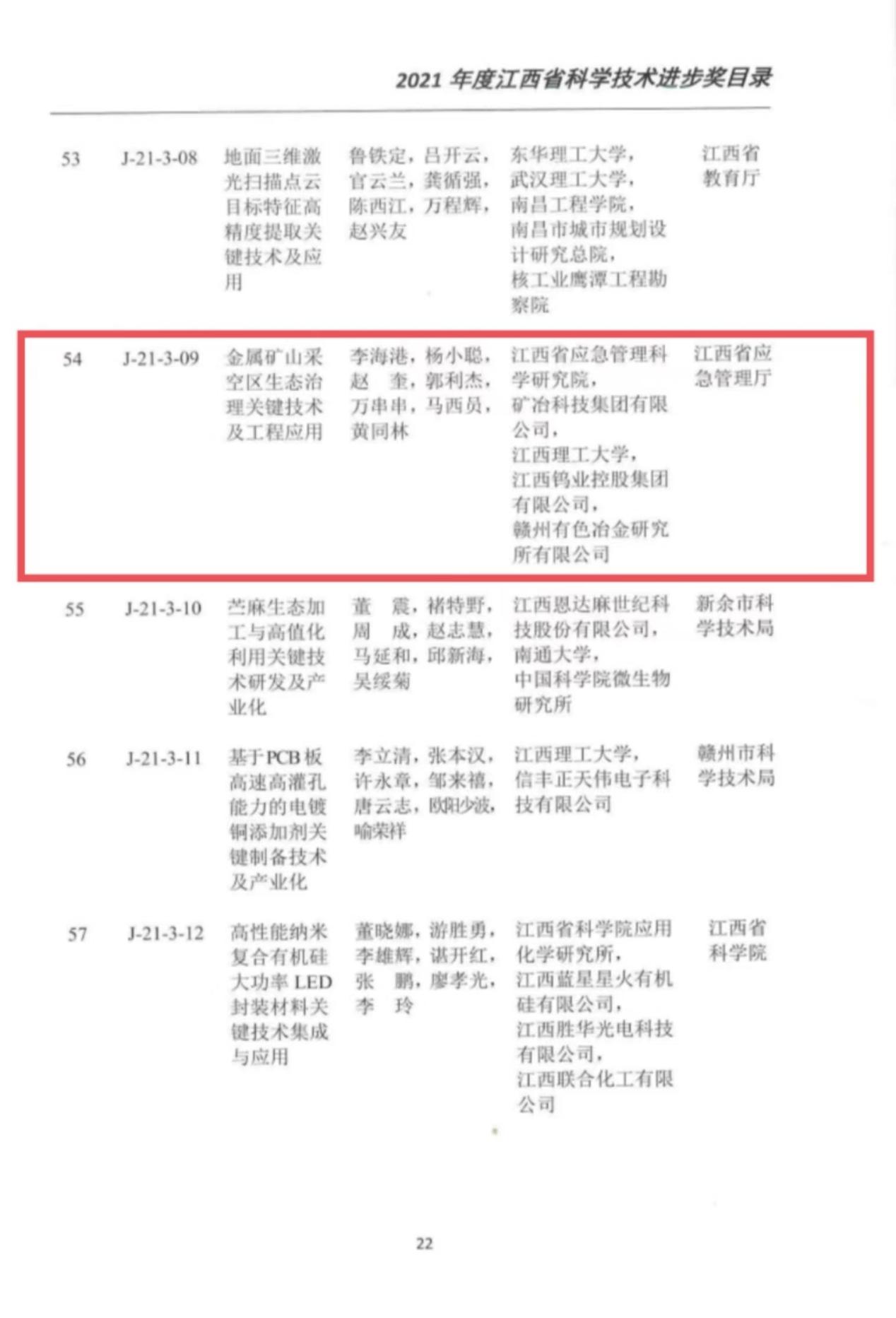 8月18日,省委、省政府召開全省科技創(chuàng)新大會,會議表彰了2021年度江西省科學技術獎獲獎成果,省應急管理科學研究院聯(lián)合礦冶科技集團有限公司、江西理工大學、江西鎢業(yè)控股集團有限公司共同申報的“金屬礦山采空區(qū)生態(tài)治理關鍵技術及工程應用”成果榮獲江西省科技進步三等獎,首次以第一承擔單位榮獲省科技進步獎,標志著省應急廳與國家級大院大所的科創(chuàng)平臺合作運行取得了顯著成效。